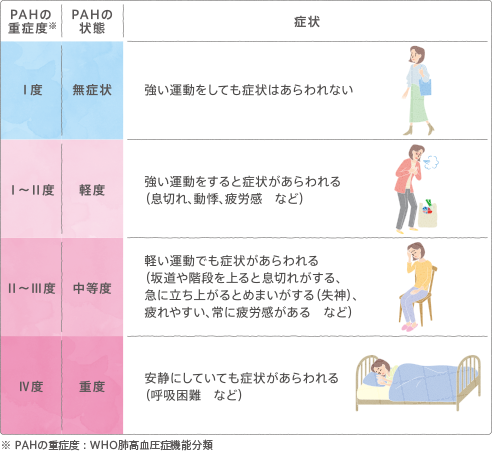 本サイトはヤンセンファーマ株式会社が運営する、肺動脈性肺高血圧症(PAH)患者さん向けのサイトです。PAHは病気の進行とともに症状があらわれます。このページではPAHの重症度について紹介しています。