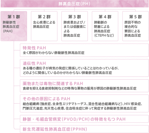 肺動脈性肺高血圧症(PAH)はPHの1つであり、原因によっていくつかの種類があります